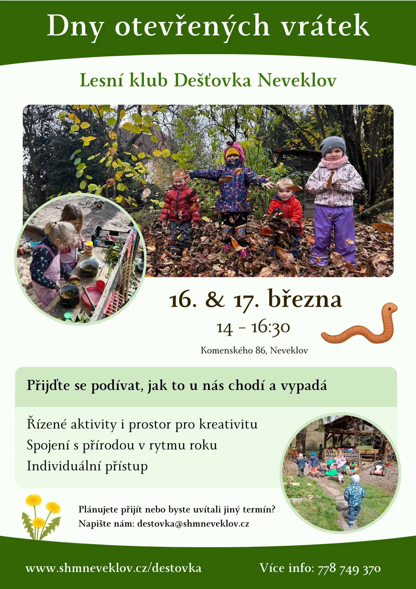 Přijďte nás navštívit mezi 14:00 a 16:30 do Lesního klubu Dešťovka na adrese Komenského 86, Neveklov. Uvidíte, jak vypadá naše běžné odpoledne.