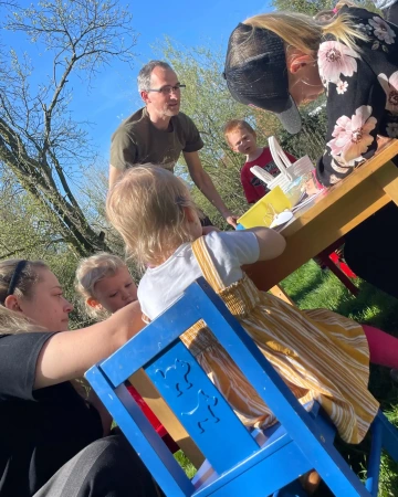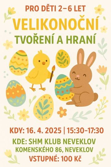 Ve středu 16. dubna 2025 se zahrada SHM klubu Neveklov proměnila v místo plné jarní radosti a tvořivosti. Uskutečnilo se odpoledne s názvem Velikonoční tvoření a hraní pro děti od 2 do 6 let a jejich blízké – rodiče, prarodiče i kamarády.